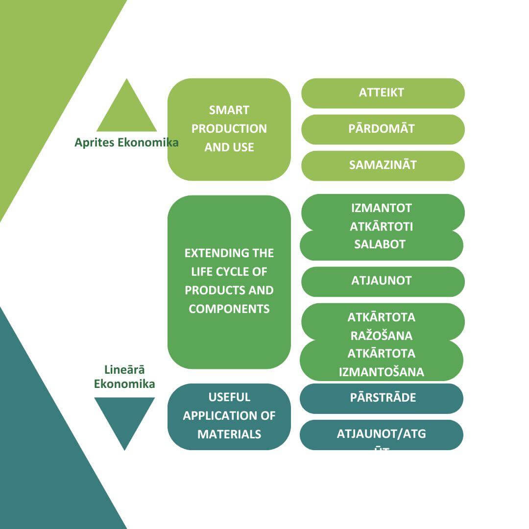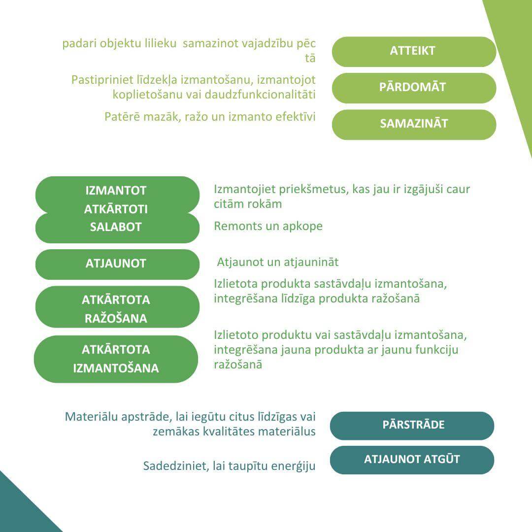Ir dažas “R” cikliskās stratēģijas, kas palīdz organizācijām padarīt savus procesus ilgtspējīgākus, pārdomāt savu biznesa modeli, izvairīties no pārmērīgas resursu patēriņa un būt efektīvākiem, saglabājot vērtību. Šīs stratēģijas bieži vien papildina viena otru un veido pieeju, lai sasniegtu apriti un atbrīvotu ilgtspējīgas, reģeneratīvas ekonomikas pilno potenciālu.